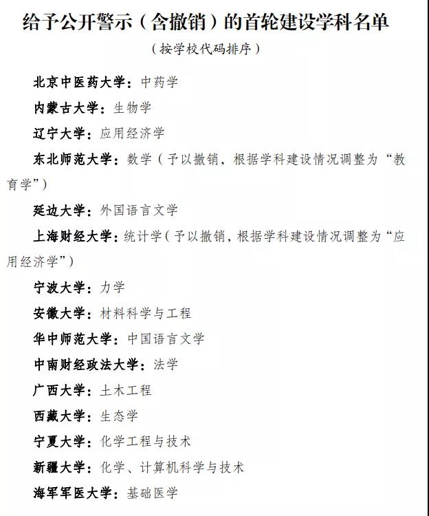 根據(jù)國務院《統(tǒng)籌推進世界一流大學和一流學科建設總體方案》,以及教育部、財政部、國家發(fā)展改革委《關于深入推進世界一流大學和一流學科建設的若干意見》和《統(tǒng)籌推進世界一流大學和一流學科建設實施辦法(暫行)》,經(jīng)專家委員會認定,教育部等三部委研究并報國務院批準,現(xiàn)公布第二輪“雙一流”建設高校及建設學科名單(見附件1)和給予公開警示(含撤銷)的首輪建設學科名單(見附件2)。