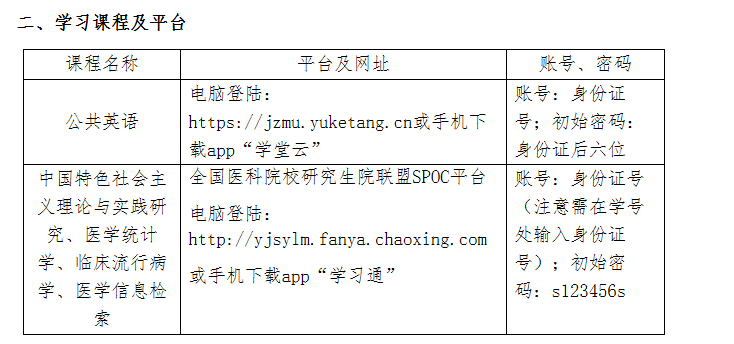 1、公共英語:初次登錄平臺需先微信關(guān)注”雨課堂“公眾號,公眾號界面點擊更多-身份綁定-增加學(xué)校,搜索添加錦州醫(yī)科大學(xué)研究生學(xué)院,輸入身份證號及密碼,初始密碼為身份證號后六位。綁定成功后,電腦登陸網(wǎng)址: