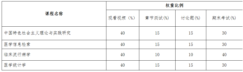 2、中國特色社會主義理論與實踐研究、醫(yī)學(xué)統(tǒng)計學(xué)、臨床流行病學(xué)、醫(yī)學(xué)信息檢索:課程成績以四個模塊折算“課程視頻學(xué)習(xí)情況+章節(jié)測試+討論+考試”,具體占比見下表: