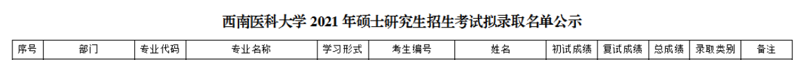 為幫助各位考生及時了解錄取結(jié)果,醫(yī)學教育網(wǎng)小編在西南醫(yī)科大學研究生院的官網(wǎng)上查找到了“西南醫(yī)科大學2021年碩士研究生招生考試擬錄取名單公示”通知內(nèi)容如下,請同學仔細查看!有問題請及時聯(lián)系學校!