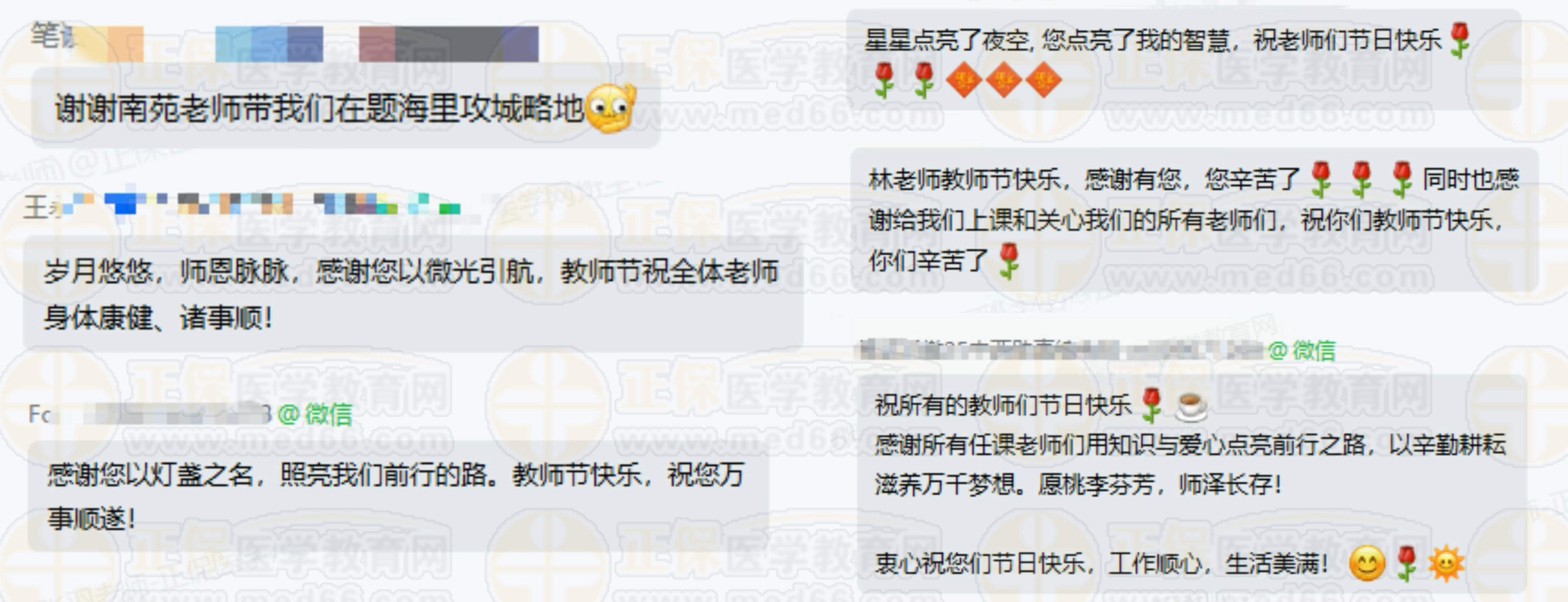 這些看似簡(jiǎn)單的舉動(dòng),卻蘊(yùn)含著學(xué)員們對(duì)老師們深深的敬愛。每一份祝福背后都是一顆顆渴望學(xué)習(xí)、追求進(jìn)步的心靈。老師們用他們的智慧點(diǎn)亮了學(xué)員們的醫(yī)考之路,而學(xué)員們的收獲和通關(guān)取證則是對(duì)老師們最好的回報(bào)。