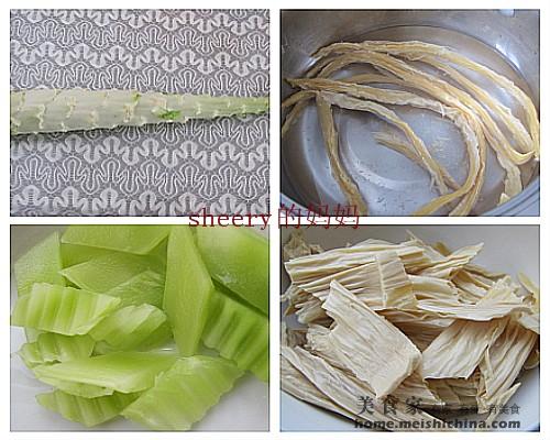 1、萵苣刨去皮,洗凈后切成片,腐竹泡發(fā)好后斜切成塊。