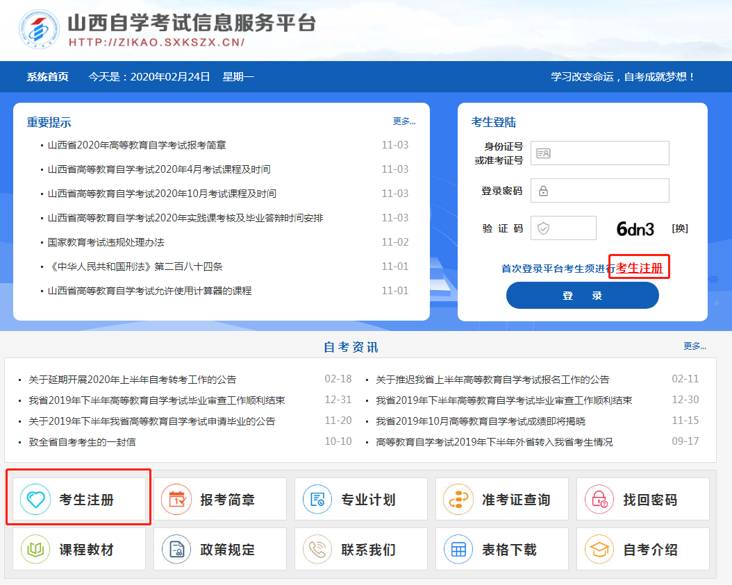 二、進(jìn)入“山西自學(xué)考試信息服務(wù)平臺”,考生可以通過“身份證號或準(zhǔn)考證號”+“密碼”登錄系統(tǒng)。首次報考的新生需要先進(jìn)行考生注冊,未獲得登錄密碼的在籍考生也需要進(jìn)行考生注冊。
