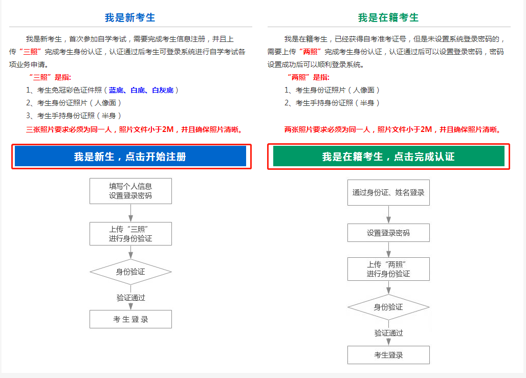 1、新考生首次報考需要上傳“證件照(藍(lán)底、白底、白灰底免冠彩色照片)、身份證人像面照、手持身份證照”,系統(tǒng)認(rèn)證通過后即獲取報名資格,便可登錄系統(tǒng)進(jìn)行報考繳費。