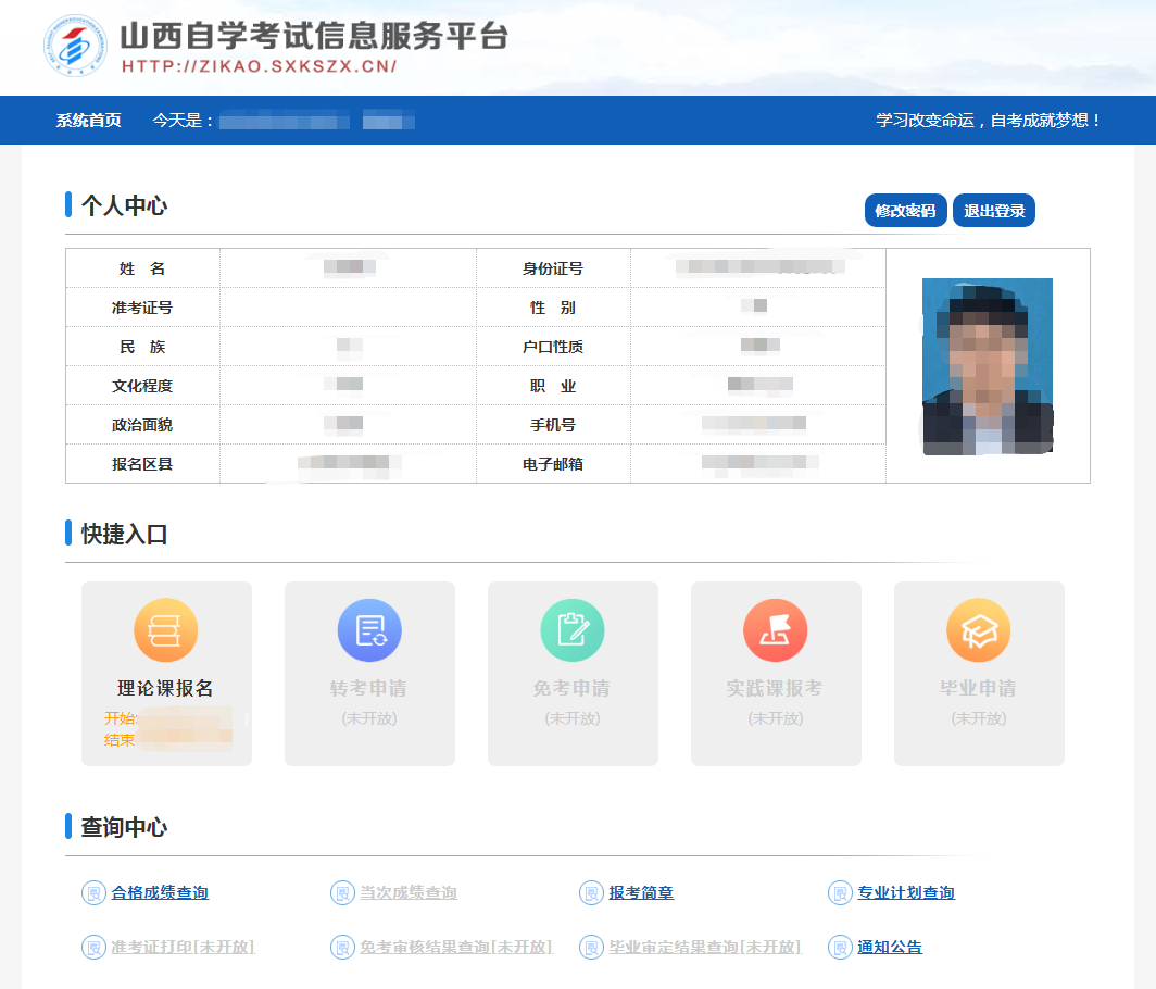 四、個人中心,考生身份認(rèn)證通過后即可登錄系統(tǒng),登錄成功后進(jìn)入“個人中心”??忌赏ㄟ^快捷入口和查詢中心辦理相關(guān)業(yè)務(wù)。