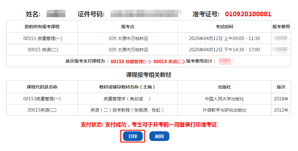 6、訂單支付成功,考生生成準(zhǔn)考證號,考生可點擊下方按鈕“查看訂單并打印”,進(jìn)行報考信息的查看與打印。如需打印報考信息可點擊報考詳情頁下方“打印”按鈕。