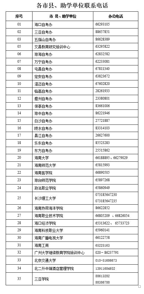 海南省高等教育自學(xué)考試的考點分別設(shè)在海口(含???、澄邁、儋州、白沙、臨高、昌江的考生)、三亞(含三亞、陵水、樂東、東方、五指山、保亭、瓊中的考生)、文昌、瓊海(含瓊海、萬寧、定安、屯昌的考生)和三沙等五個考區(qū)。具體考試地點以考試通知單上的地點為準。考生接到考試通知單后,應(yīng)于考試前一天到指定的考試地點查看考場平面圖,找到自己的考場所在位置。英語聽力、口語、口譯與聽力的考試設(shè)在海南師范大學(xué)(65815993),計算機應(yīng)用基礎(chǔ)(實踐)、管理系統(tǒng)中計算機應(yīng)用(實踐)的考試地點設(shè)在海南大學(xué)(66188895),其它實踐性環(huán)節(jié)考試地點分別設(shè)在各主考院校。
