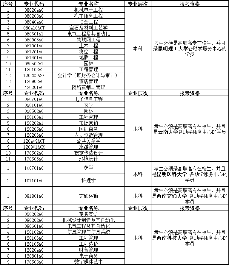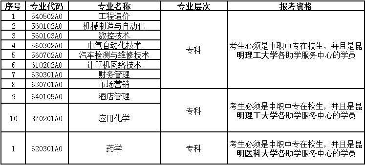 3.以下專業(yè)非在??忌荒軋?bào)考。報(bào)考以下專業(yè)的考生,必須具備表內(nèi)要求的報(bào)考資格,否則成績將不予認(rèn)可且不能取得畢業(yè)證書。