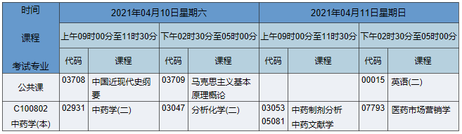 2021年4月湖南自考本科中藥學(xué)專業(yè)考試時(shí)間為2021年4月10日-11日,2021年4月湖南自考本科中藥學(xué)專業(yè)課程安排如下: