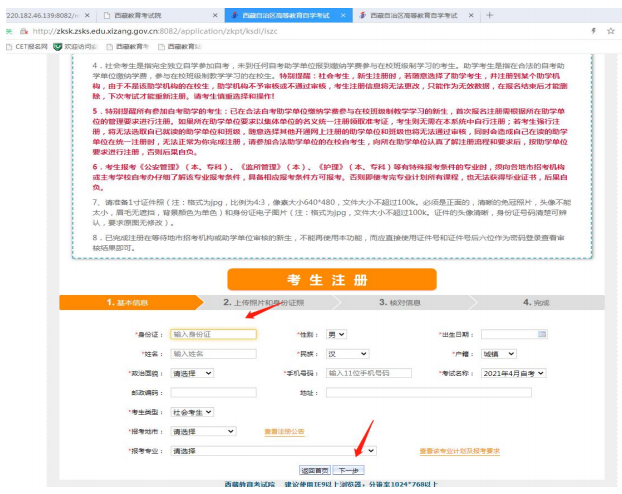 請考生登陸西藏教育考試院官方網(wǎng)站(網(wǎng)址:http://zsks.edu.xizang.gov.cn)或“西藏微青年”微信公眾號,點擊“西藏自治區(qū)高等教育自學考試信息管理綜合平臺”(網(wǎng)址:http://zksk.zsks.edu.xizang.gov.cn:8082)按流程提示完成網(wǎng)上報名。