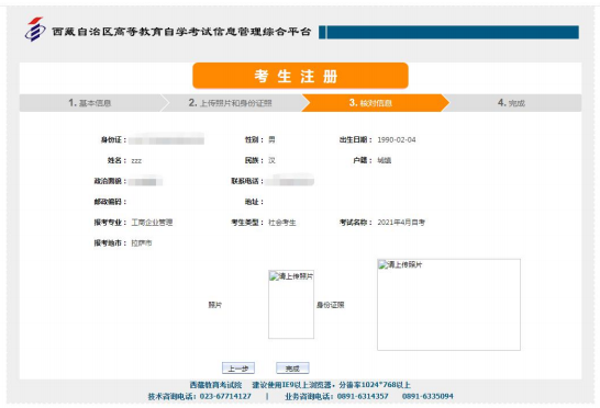 4、新生在本頁面核對個人所填全部信息,無誤后點擊“完成”,然后等待所填考試地招辦審核通過(一個工作日內完成)。