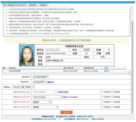 7、在如下頁面里按照報考專業(yè)課程計劃,選擇報考的課程,完成后點擊“下一步”