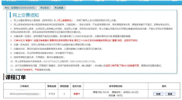 8、在如下頁面核對報考科目信息,確認后點擊“繳費”按鈕,系統(tǒng)自動跳轉到繳費頁面。