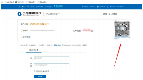 9、在繳費頁面,考生用微信掃一掃箭頭所指的二維碼完成繳費工作