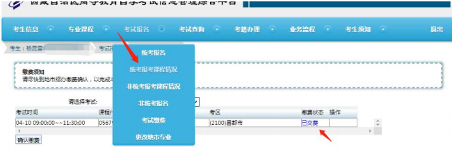 10、繳費完成后,點擊考試報名里面的“統(tǒng)考報考課程情況”,查看繳費狀態(tài),顯示“已繳費”說明本次報考成功。