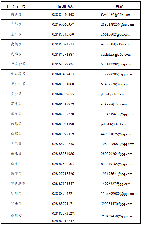 現(xiàn)將成都市各區(qū)(市)縣招考機(jī)構(gòu)報(bào)名期間聯(lián)系電話及郵箱公布如下: