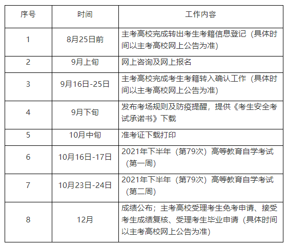 根據(jù)2021年下半年(第79次)上海市高等教育自學考試相關安排,現(xiàn)將重要工作日程公布如下,請考生關注上海市教育考試院“上海招考熱線”網(wǎng)站(www.shmeea.edu.cn)和各主考高校網(wǎng)站通知,切勿錯過報名、轉免考、畢業(yè)申請等業(yè)務辦理時間。若日程有變動,請以上海市教育考試院和各主考高校發(fā)布的通知為準。