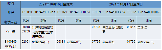 2021年10月湖南自考本科藥學(xué)專業(yè)課程安排表