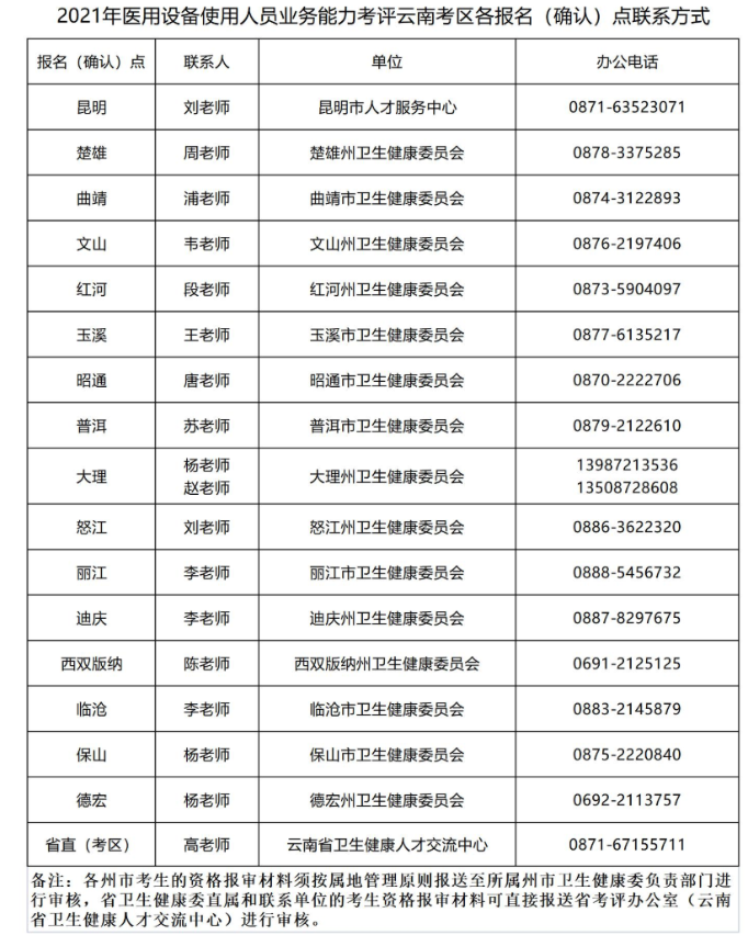 2021年醫(yī)用設(shè)備使用人員業(yè)務(wù)能力考評(píng)云南考區(qū)各報(bào)名(確認(rèn))點(diǎn)聯(lián)系方式