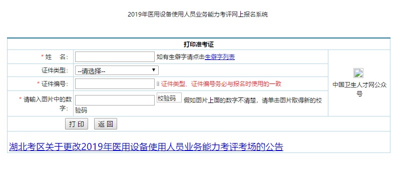 【通知】2019年醫(yī)用設(shè)備使用人員業(yè)務(wù)能力考評(píng)準(zhǔn)考證打印入口已開通!