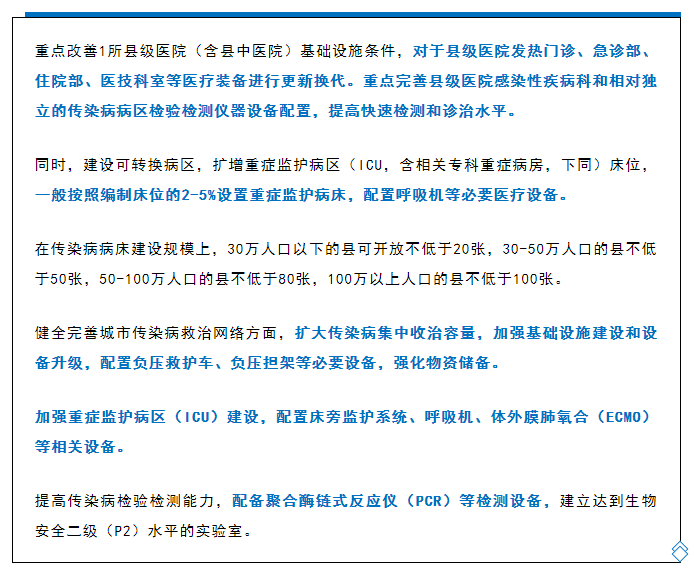 顯然,國家財政對于基層乃至縣級醫(yī)院的支持力度一直在不斷的加大。而在此前國家衛(wèi)健委發(fā)布的通知中還重點強調(diào),要推動貧困縣級醫(yī)院達到基本標(biāo)準(zhǔn),加大對縣級醫(yī)院的投入力度,適度超前規(guī)劃布局,完善獨立傳染病病區(qū)功能,提高檢驗檢測、影像檢查能力,提高縣級醫(yī)院平戰(zhàn)轉(zhuǎn)換能力。這也就意味著,此次財政資金下發(fā)后,大批基層醫(yī)院的相關(guān)建設(shè)也將開始啟動。后疫情時期,醫(yī)療新基建設(shè)備配置清單下發(fā)現(xiàn)階段,由于此前新冠疫情的影響,后疫情時期國家對于公立醫(yī)療機構(gòu)以及基層公衛(wèi)建設(shè)的要求也衍生出了新的要求。早在此前7月初,國家衛(wèi)健委就發(fā)布文件對公共衛(wèi)生防控救治能力建設(shè)的設(shè)備配置進行了明確,要求: