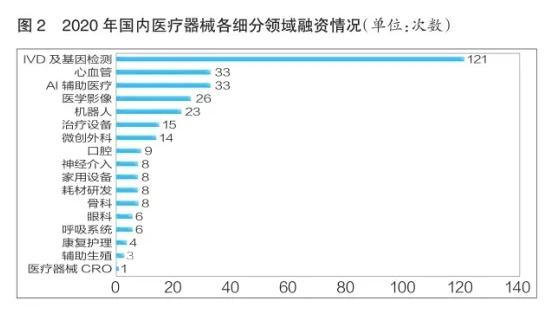 從融資次數(shù)看,2020年,體外診斷(IVD)及基因檢測領(lǐng)域融資事件達(dá)121起,占比超過36%;心血管、醫(yī)學(xué)影像等國產(chǎn)替代重點(diǎn)領(lǐng)域仍是投資熱點(diǎn)。在醫(yī)療智能化趨勢與應(yīng)用場景逐步拓寬的背景下,AI輔助醫(yī)療與醫(yī)療機(jī)器人等領(lǐng)域獲資本追捧,融資事件分別為33起、23起。此外,輔助生殖、醫(yī)療器械CRO等新賽道開始吸引資本關(guān)注(見圖2)。