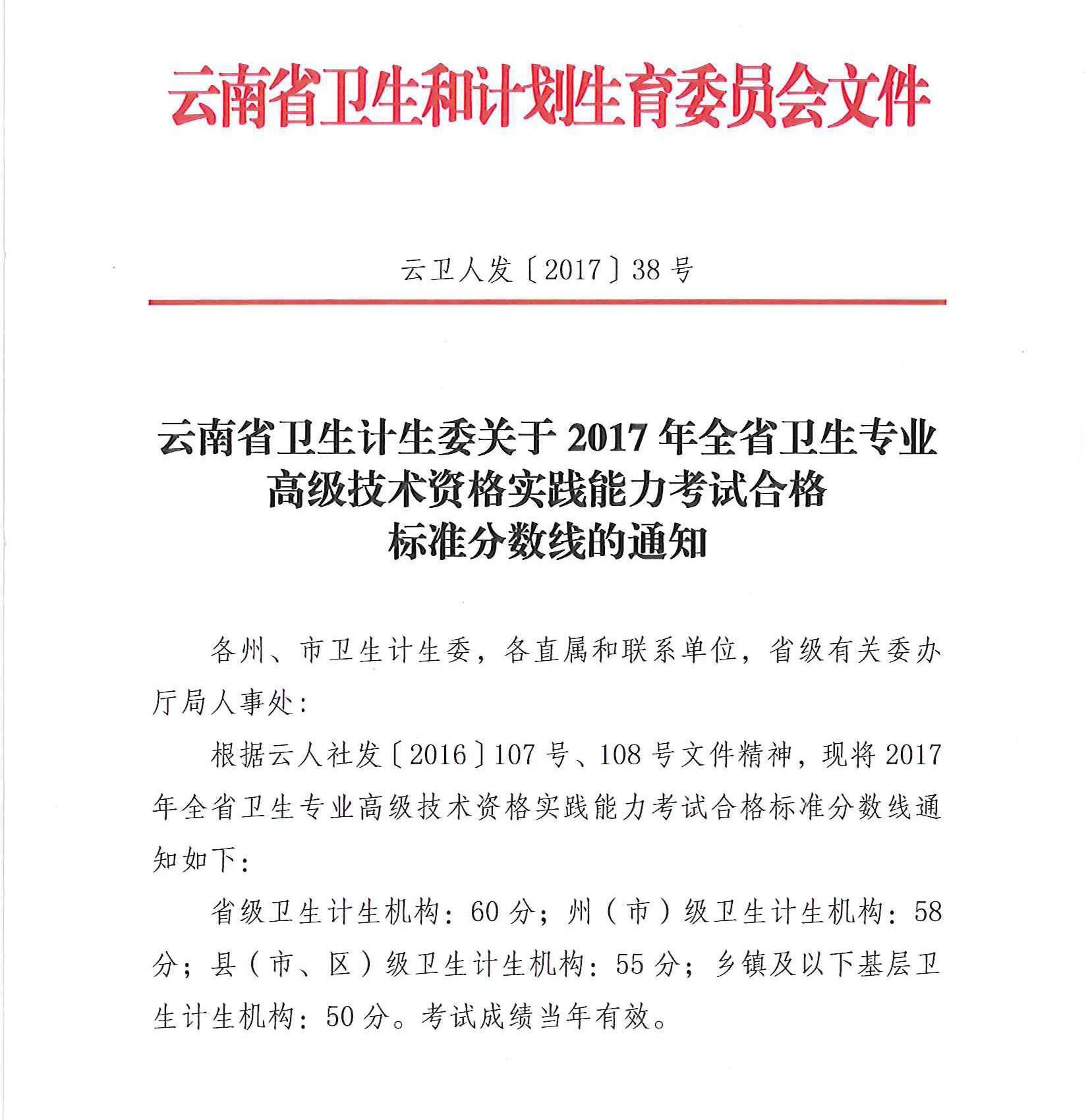 日前,云南省發(fā)布關(guān)于2017年全省衛(wèi)生專業(yè)高級(jí)技術(shù)資格實(shí)踐能力考試合格標(biāo)準(zhǔn)分?jǐn)?shù)線的通知,省級(jí)衛(wèi)生計(jì)生機(jī)構(gòu)60分;州(市)級(jí)衛(wèi)生計(jì)生機(jī)構(gòu)58分;縣(市、區(qū))級(jí)衛(wèi)生計(jì)生機(jī)構(gòu)55分;鄉(xiāng)鎮(zhèn)及以下基層衛(wèi)生計(jì)生機(jī)構(gòu)50分。具體內(nèi)容如下: