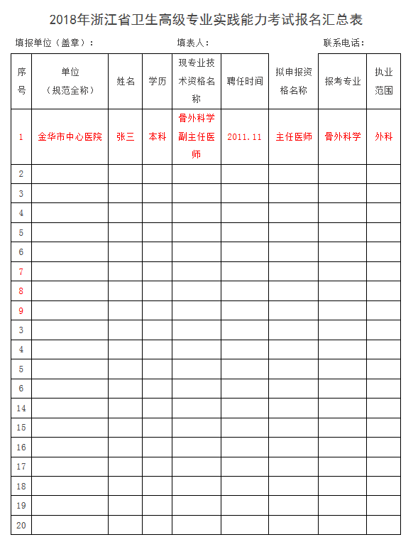 附件:2018年浙江省衛(wèi)生高級(jí)專業(yè)實(shí)踐能力考試報(bào)名匯總表