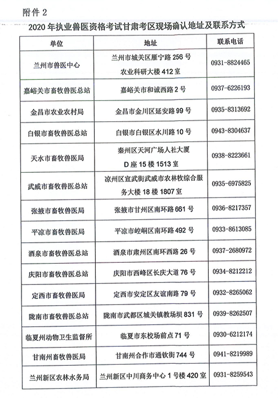 2020年執(zhí)業(yè)獸醫(yī)資格考試甘肅考區(qū)現(xiàn)場確認地址及聯(lián)系方式