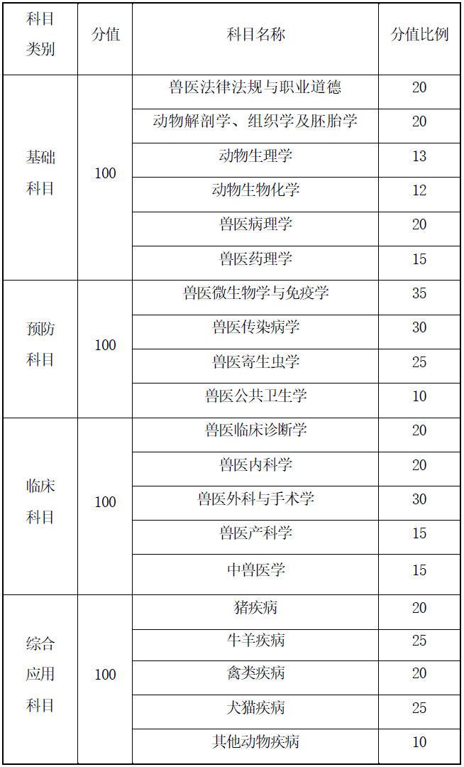 全國執(zhí)業(yè)獸醫(yī)資格考試(獸醫(yī)全科類)考試主要考察執(zhí)業(yè)獸醫(yī)應(yīng)該掌握的基本理論、基本技術(shù)和基本操作能力?;A(chǔ)科目主要考察應(yīng)試者必須掌握的與臨床實踐相關(guān)的基本理論知識;預(yù)防科目主要考察常發(fā)和多發(fā)的動物疫病與人畜共患病的知識與技能;臨床科目主要考察臨床常見和多發(fā)普通病的診斷和治療技能;綜合應(yīng)用科目主要考察應(yīng)試者對一些常發(fā)重大疾病的處置、防控與治療的綜合能力。全國執(zhí)業(yè)獸醫(yī)資格考試(獸醫(yī)全科類)每個科目100道題,每科100分,總分400分??荚嚪秶垍⒖既珖鴪?zhí)業(yè)獸醫(yī)資格考試委員會審定頒布的《全國執(zhí)業(yè)獸醫(yī)資格考試大綱(獸醫(yī)全科類)(2020版)》。