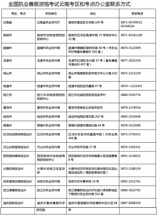 2020年云南執(zhí)業(yè)獸醫(yī)考試考點辦公室聯(lián)系方式