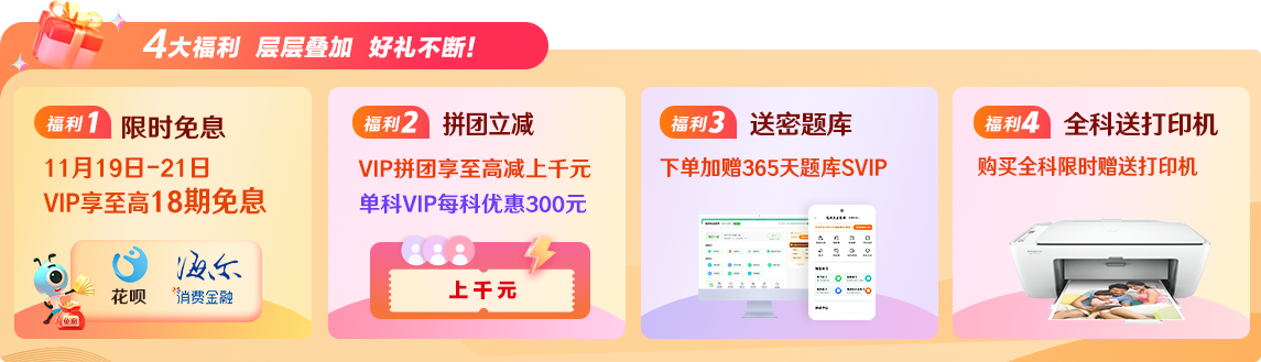 3、限時特惠:單科VIP每科優(yōu)惠300元;與免息同享,下單贈365天密題庫SVIP。