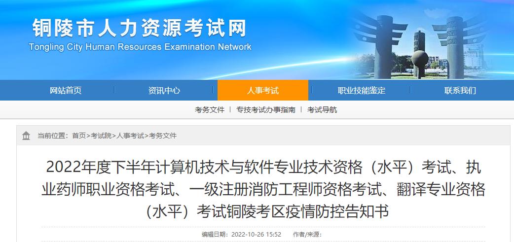 2022年度下半年計算機技術(shù)與軟件專業(yè)技術(shù)資格(水平)考試、執(zhí)業(yè)藥師職業(yè)資格考試、一級注冊消防工程師資格考試、翻譯專業(yè)資格(水平)考試銅陵考區(qū)將于11月5日至6日舉行。為切實保障廣大應(yīng)試人員的生命安全和身體健康,確保本次考試安全有序進行,現(xiàn)就有關(guān)事項告知如下。