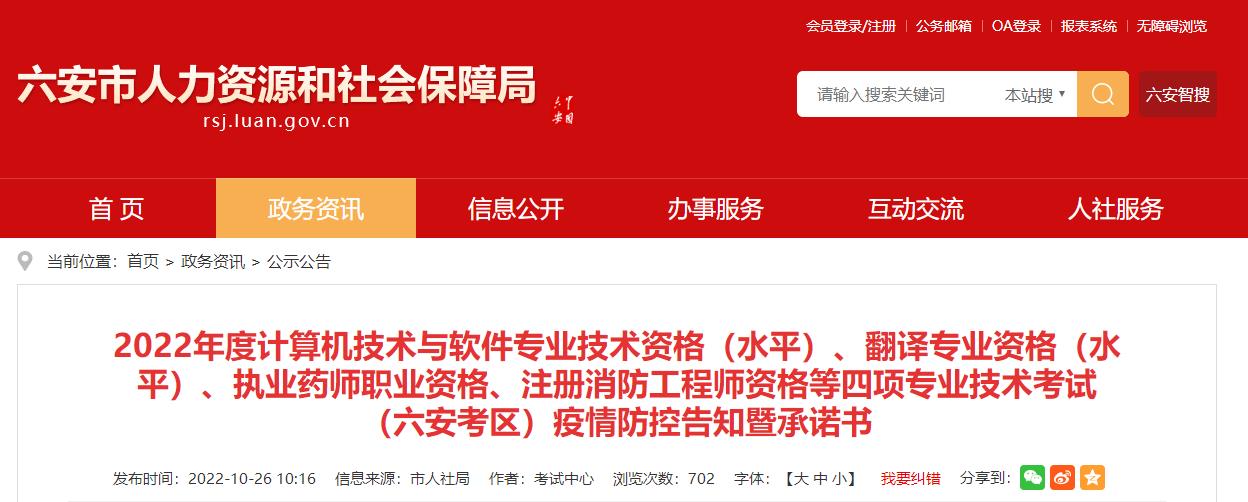 近期,小編查詢各地區(qū)人事考試官網(wǎng),發(fā)現(xiàn)安徽六安人力資源和社會保障局發(fā)布了《2022年度計算機技術(shù)與軟件專業(yè)技術(shù)資格(水平)、翻譯專業(yè)資格(水平)、執(zhí)業(yè)藥師職業(yè)資格、注冊消防工程師資格等四項專業(yè)技術(shù)考試(六安考區(qū))疫情防控告知暨承諾書》的通知,為了幫助考生們了解,小編為大家整理如下!