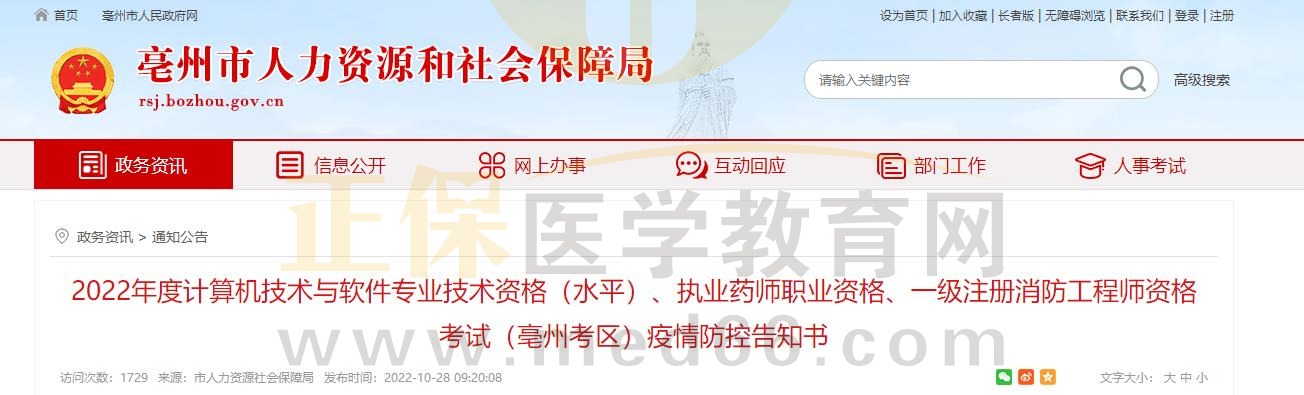 安徽亳州人力資源和社會(huì)保障局發(fā)布了《2022年度計(jì)算機(jī)技術(shù)與軟件專(zhuān)業(yè)技術(shù)資格(水平)、執(zhí)業(yè)藥師職業(yè)資格、一級(jí)注冊(cè)消防工程師資格考試(亳州考區(qū))疫情防控告知書(shū)》的通告,醫(yī)學(xué)教育網(wǎng)整理分享如下:
