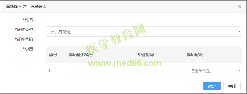 4,填寫完畢確認(rèn)無(wú)誤后點(diǎn)擊【提交】,出現(xiàn)信息確認(rèn),需要考生重新輸入姓名、證件類型、證件類別、證件號(hào)碼、學(xué)歷、學(xué)位信息進(jìn)行二次確認(rèn)。如下圖所示: