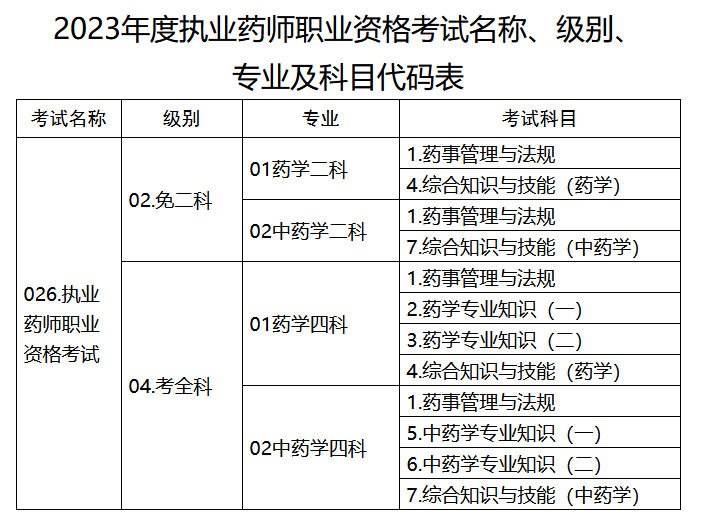 2.2023年度執(zhí)業(yè)藥師職業(yè)資格考試名稱、級(jí)別、專業(yè)及科目代碼表
