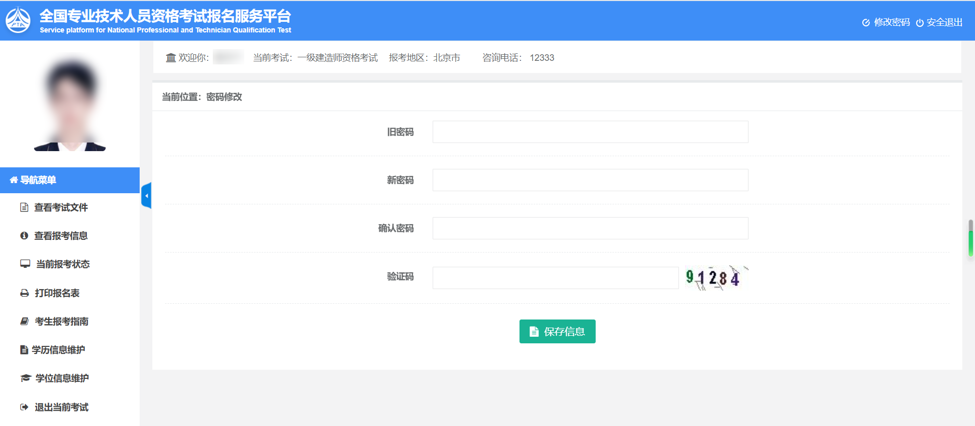 在頁面中輸入舊密碼、新密碼、確認新密碼、驗證碼,點擊【保存信息】按鈕,完成修改密碼操作。