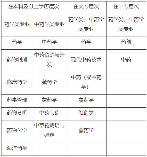 報考條件中要求的“藥學類、中藥學類專業(yè)”,按照國務院學位委員會、教育部印發(fā)的《學位授予和人才培養(yǎng)學科目錄設置與管理辦法》《普通高等學校高等職業(yè)教育(??疲I(yè)設置管理辦法》和《學位授予和人才培養(yǎng)學科目錄》《普通高等學校本科專業(yè)目錄(2012年)》《普通高等學校高等職業(yè)教育(??疲I(yè)目錄(2015年)》等規(guī)定,對照學科目錄來界定。