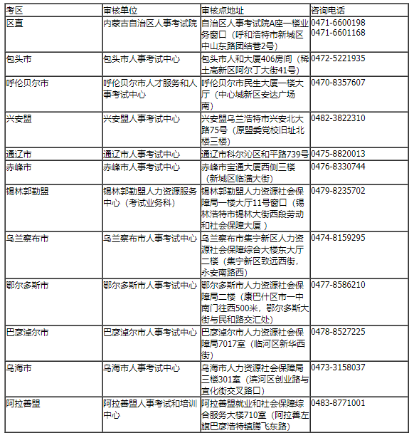 自治區(qū)及各盟市人事考試機(jī)構(gòu)資格審核地址、咨詢電話