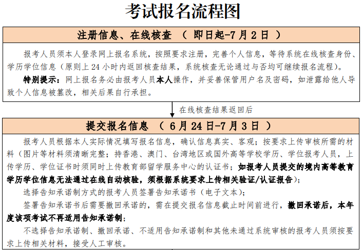 2.提交報名信息時間為 2024 年 6 月 24 日至 7 月 3 日。注冊信息原則上 24 小時內(nèi)返回核查結(jié)果,建議報考人員提前完成用戶注冊及學(xué)歷、學(xué)位等信息維護(hù),以免錯過報名。為加強(qiáng)報名證明事項告知承諾制事中監(jiān)管,如報考人員提交的境內(nèi)高等教育學(xué)歷學(xué)位信息無法通過在線自動核驗,應(yīng)在報名前及時登錄中國高等教育學(xué)生信息網(wǎng)(學(xué)信網(wǎng))進(jìn)行驗證/認(rèn)證,下載相關(guān) PDF格式在線驗證/認(rèn)證報告,報名期間按要求上傳相關(guān)驗證/認(rèn)證報告,接受人工核查。