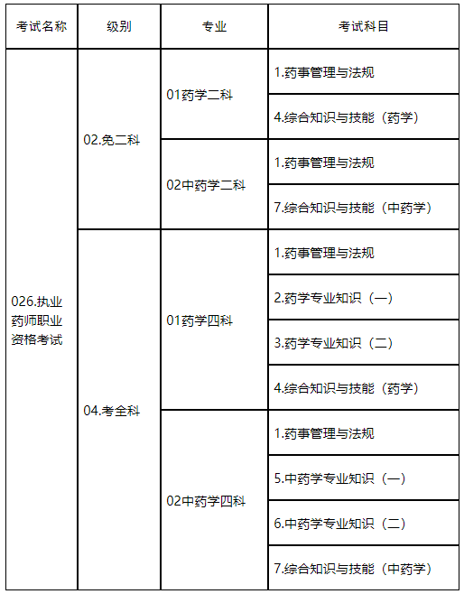 執(zhí)業(yè)藥師職業(yè)資格考試名稱、級別、專業(yè)及考試科目信息設置如下: