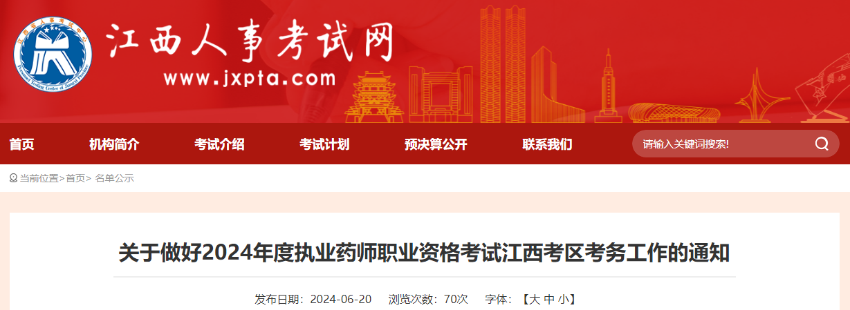 根據(jù)《人力資源社會保障部辦公廳關(guān)于2024年度專業(yè)技術(shù)人員職業(yè)資格考試計劃及有關(guān)事項的通知》(人社廳發(fā)〔2024〕1號)和《人力資源和社會保障部人事考試中心關(guān)于做好2024年度執(zhí)業(yè)藥師職業(yè)資格考試考務(wù)工作的通知》(人考中心函〔2024〕29號)精神,為做好2024年度執(zhí)業(yè)藥師職業(yè)資格考試江西考區(qū)各項工作,現(xiàn)將有關(guān)事項通知如下: