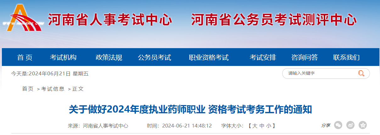 為做好我省2024年度執(zhí)業(yè)藥師職業(yè)資格考試考務工作,根據(jù)《人力資源社會保障部辦公廳關于2024年度專業(yè)技術人員職業(yè)資格考試計劃及有關事項的通知》(人社廳發(fā)〔2024〕1號)、人力資源和社會保障部人事考試中心《關于2024年度執(zhí)業(yè)藥師職業(yè)資格考試考務工作的通知》(人考中心函〔2024〕29號)精神,現(xiàn)將有關事項通知如下: