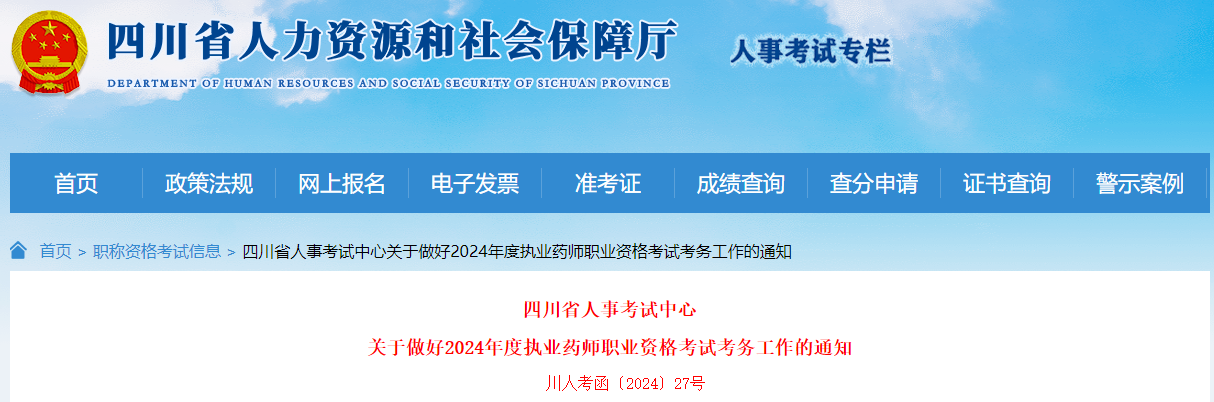 根據(jù)人力資源和社會保障部人事考試中心《關(guān)于做好2024年度執(zhí)業(yè)藥師職業(yè)資格考試考務(wù)工作的通知》(人考中心函〔2024〕29號)及四川省人力資源和社會保障廳《關(guān)于做好我省專業(yè)技術(shù)人員資格考試告知承諾制有關(guān)工作的通知》(川人社辦發(fā)〔2020〕14號)等文件精神,2024年度執(zhí)業(yè)藥師職業(yè)資格考試將于10月19、20日舉行,考試形式為電子化考試(機考),為切實做好考試考務(wù)工作,現(xiàn)將有關(guān)事項通知如下: