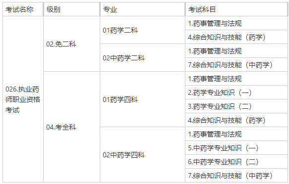 藥學類考試科目:《藥學專業(yè)知識(一)》《藥學專業(yè)知識(二)》《藥事管理與法規(guī)》《藥學綜合知識與技能》。
