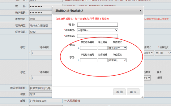 填寫(xiě)完畢確認(rèn)無(wú)誤后點(diǎn)擊【提交】,出現(xiàn)信息確認(rèn),需要考生重新輸入姓名、證件類(lèi)型、證件類(lèi)別、證件號(hào)碼、學(xué)歷、學(xué)位信息進(jìn)行二次確認(rèn)。如下圖所示: