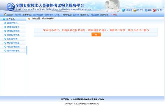 如果資格核驗不通過,考生可以通過考試狀態(tài)頁面的狀態(tài)信息欄查看到資格核驗不通過的原因,如確實不符合報考條件,可以點擊左側(cè)【修改報名信息】修改報名條件重新進行報名信息確認,等待考試機構(gòu)審核。(見下圖)。