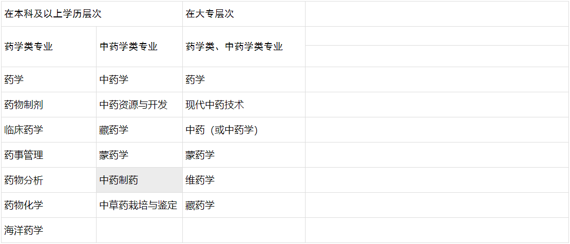 報(bào)考條件中要求的“藥學(xué)類、中藥學(xué)類專業(yè)”,按照國務(wù)院學(xué)位委員會(huì)、教育部印發(fā)的《學(xué)位授予和人才培養(yǎng)學(xué)科目錄設(shè)置與管理辦法》《普通高等學(xué)校高等職業(yè)教育(??疲I(yè)設(shè)置管理辦法》和《學(xué)位授予和人才培養(yǎng)學(xué)科目錄》《普通高等學(xué)校本科專業(yè)目錄(2012年)》《普通高等學(xué)校高等職業(yè)教育(??疲I(yè)目錄(2015年)》等規(guī)定,對(duì)照學(xué)科目錄來界定。