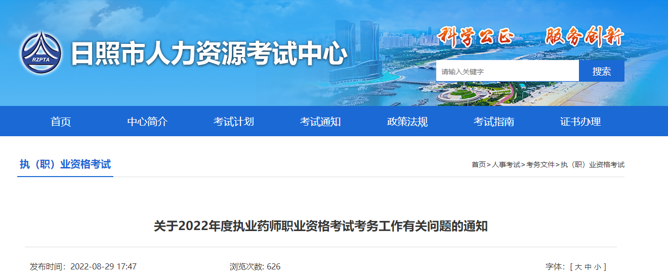 山東日照2022年度執(zhí)業(yè)藥師職業(yè)資格考試考務(wù)工作通知